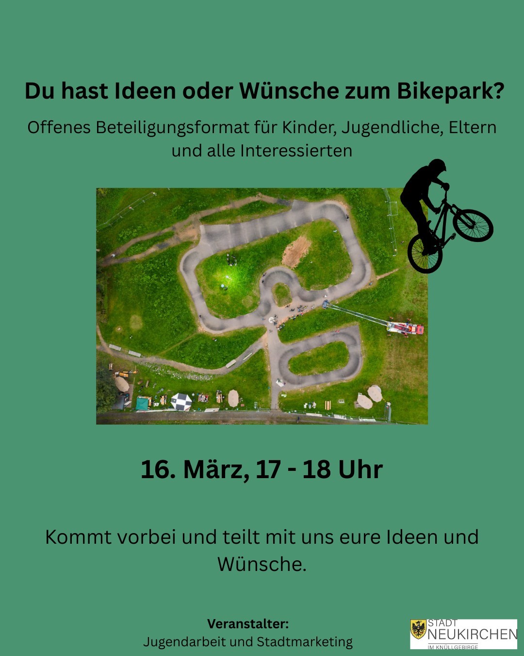 Wir möchten ein offenes Beteiligungsformat für Kinder, Jugendliche, Eltern und alle Interessierten schaffen um so den Bikepark weiterhin attraktiv zu halten.